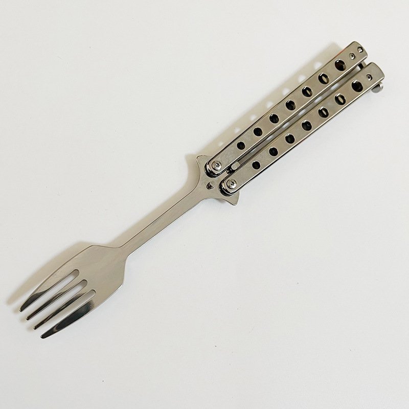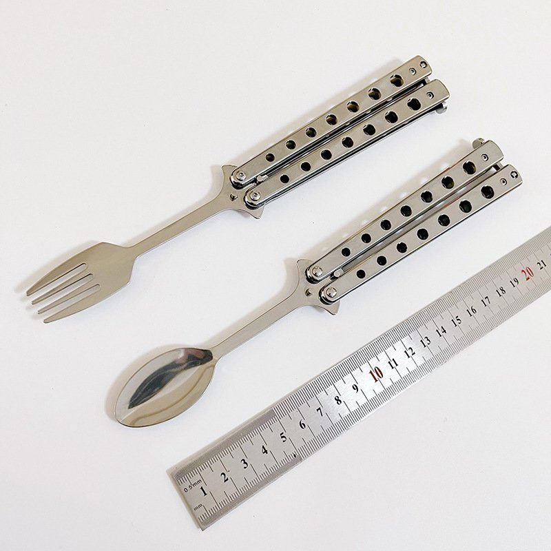 The Balisong Spoon Butterfly is a unique and multifunctional tool that combines a butterfly knife design with practical eating utensils. It features a spoon, fork, and knife for everyday use, while also serving as a training tool for butterfly knife enthusiasts. Whether you??re practicing your flipping skills or enjoying a meal, this versatile gadget offers a fun and innovative twist on traditional cutlery. Ideal for campers, outdoor enthusiasts, or anyone who enjoys a blend of functionality and creativity in their tools.